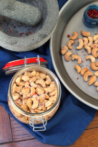 It’s Thursday, Matt’s had his knee operation and is on the sofa recovering well. I’m in and out of the kitchen testing recipes and he’s happily sampling whatever I send his way. These roasted cashews with crushed pink peppercorns have been perfect for him to nibble on in between naps and physio. They’re buttery and rich with a little bit of heat, finished off with the awesome double team of sweet and salty. If you’ve ever had salt and sweet popcorn, you’ll know it’s a game changer.